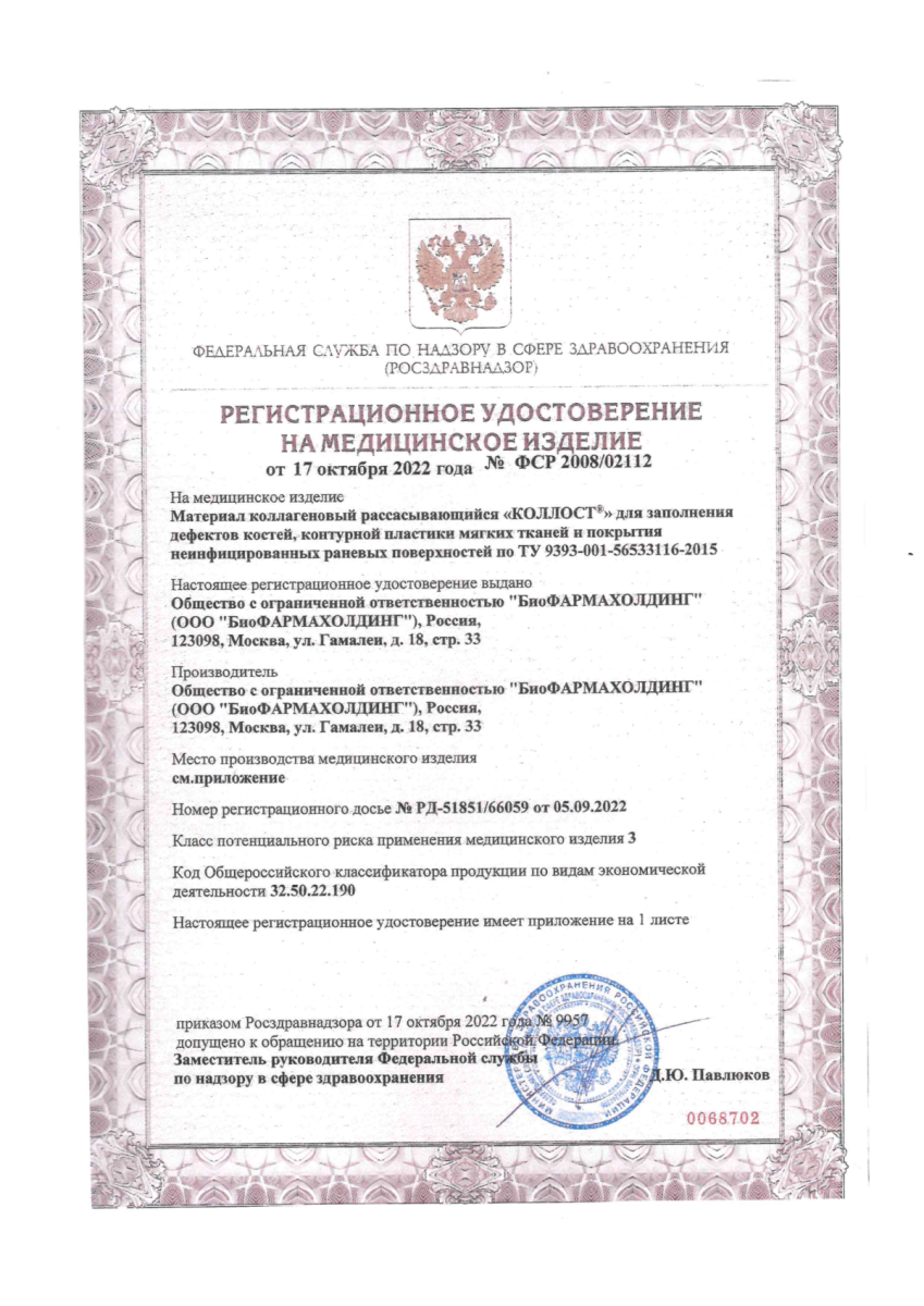 Материал коллагеновый рассасывающийся "КОЛЛОСТ"-гель 15%, 1,5см3